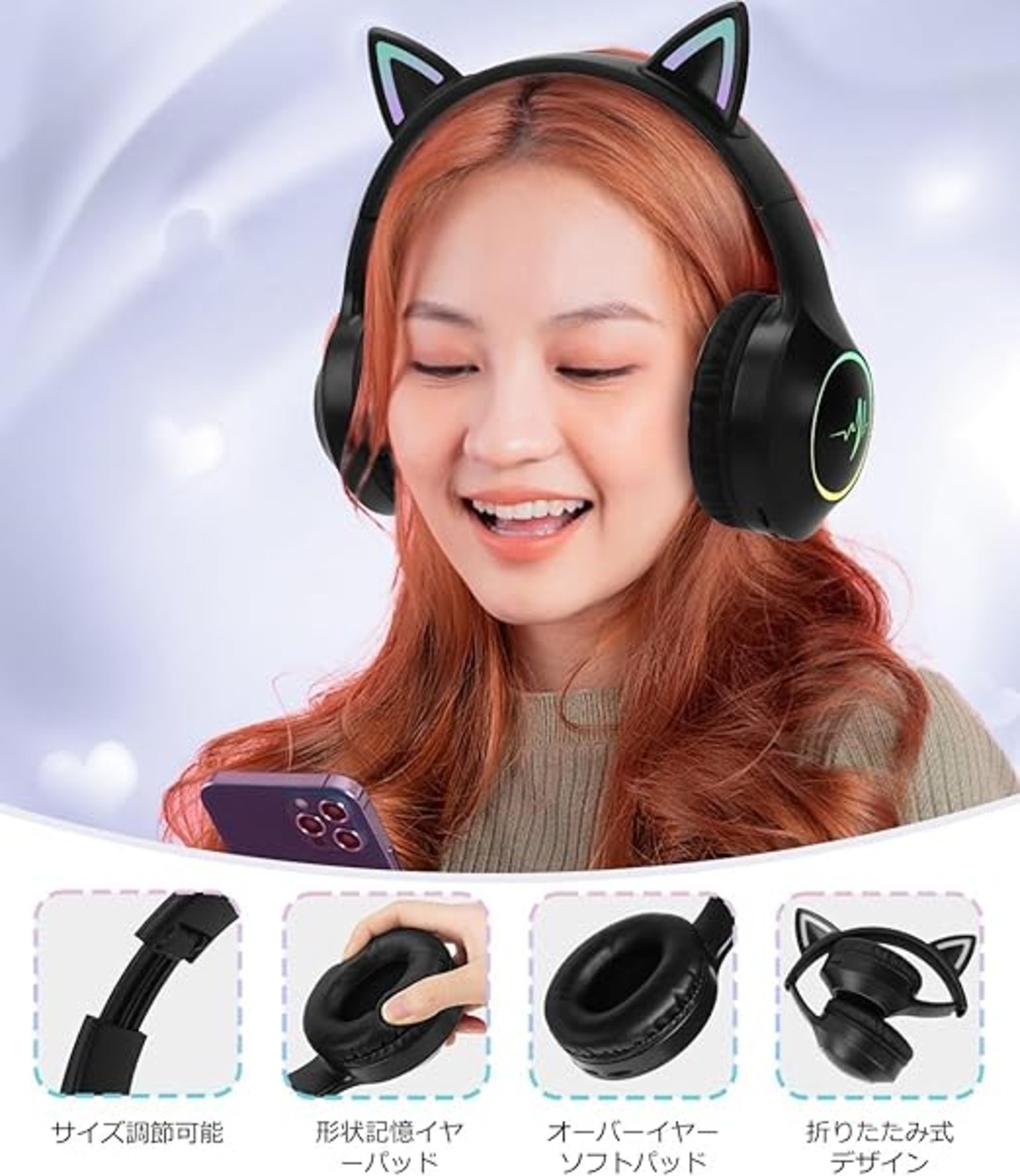Bluetooth5.3 猫耳ヘッドホン ワイヤレスヘッドフォン ピカピカ 猫耳ヘッドセット オーバーイヤーヘッドホン 遮音 密閉型 可愛い 折りたたみ 携帯便利 サイズ調節可能 有線無線兼用 大容量バッテリー 子供用 大人用 a | PCBASE