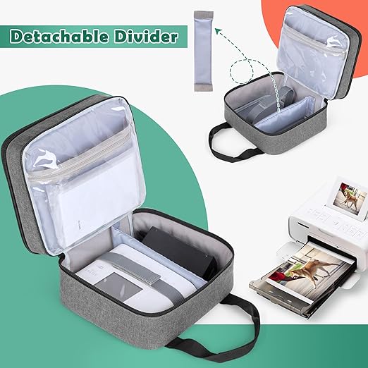 メインコンパートメント: 下の層には固定ベルトが付いており、フォトプリンターを固定できます。取り外し可能な仕切りがあるので、電源アダプターやケーブルも一緒に収納することができます。透明なジッパーポケットには写真用紙を数パック収納できます。