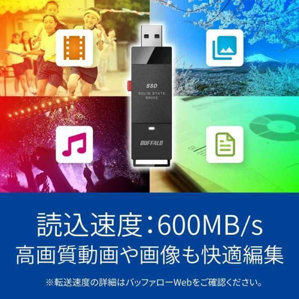 バッファロー SSD 外付け 500GB USB3.2 Gen2 読込速度600MB/秒 PS5/PS4メーカー動作確認済 コンパクト 小型 Type-Cアダプター付属 ブラック SSD-SCT500U3BA/N