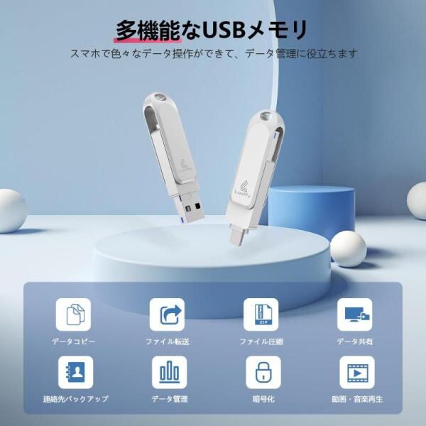 ?【1個多役のUSBメモリー】USBメモリはiOS、USB、Type-C、Micro USBの四つのコネクターを搭載し、Phone、Pad、Macbook、パソコンやAndroidスマホなどの機種の間でデータ移行は楽になります。機種に制限されなく、iPhone対応USBメモリー一個だけで機種間でデータ移行の問題を解決できます。写真、動画やファイルなどのデータを異なる機種間で共有し、他の連絡先に共有することもできて、ネット、WIFIやiTunesがなくてもデータを手軽に移行できます。