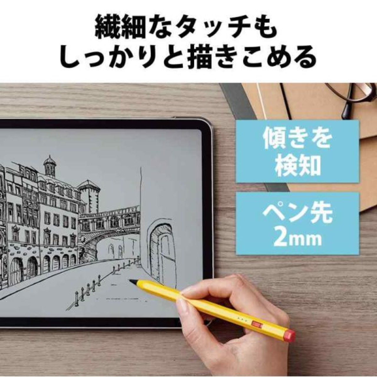 鉛筆のような形で握りやすい、iPad用の充電式アクティブタッチペンです。