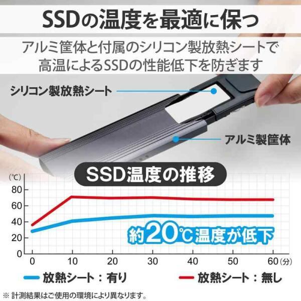 熱を逃がしやすいアルミ筐体&付属のシリコン製放熱シートで、高温になりやすいM.2 SSDの温度を最適に保ち、高温によるSSDの性能低下を防ぎます。