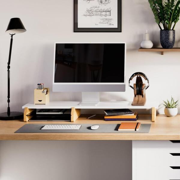 ??【環境に優しい材質 ・安全安心】こちらのパソコン台の材質は通常販売しているモニター台の材質と違って、コルクから作られる足が環境に優しく、衝撃による痛みを軽滅するのはもちろん、滑りにくく、しっかりと天板を支えて安定しています。天板にはパーティクルボード製で水や汚れがあっても拭くだけでOK。