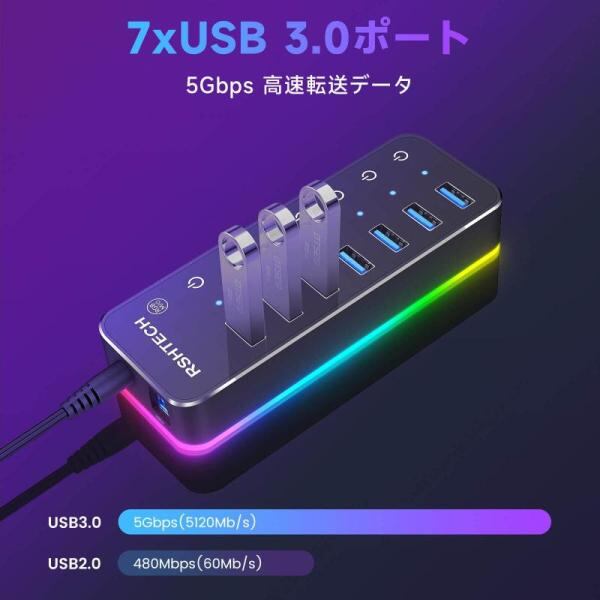 RSHTECH USBハブ 3.0 電源付き RGB 7ポート 2 in 1 ケーブル 付き USB Hub アルミ製 5Gbps高速転送 セルフパワーとバスパワー両用 5V 4A 電源 独立スイッチ付き(RSH-518R)