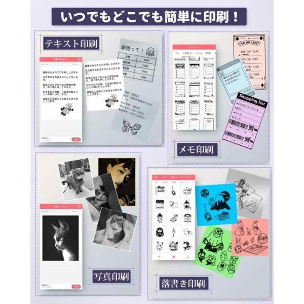 専用APPと多機能印刷:ポータブルプリンターは色々機能をサポートし、写真、メモ、リスト、メッセージ、レコード、QRコード、付箋、作業計画、会議メモなどを印刷でき、ユーザーは携帯画面の情報を即座に印刷でき、アプリケーションはさまざまな専用APPのフォント、フィルター効果、テ