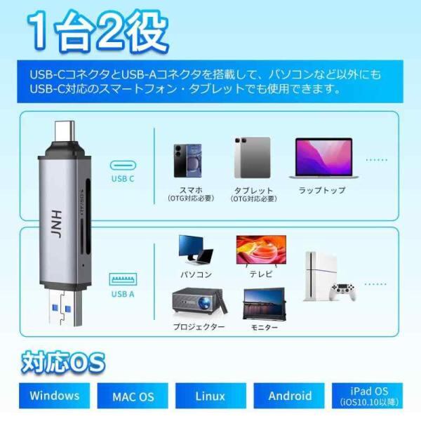 JNH カードリーダー CR-UD201 USB 3.2 DDR200モード 最高190MB/s超高速転送 Type-C OTG対応 2-in-1 SDXC microSDXC カードリーダー Android スマホ タブレット/iPhone15 シリーズ/iPad Pro/MacBook Pro Air/Windows PCに適用