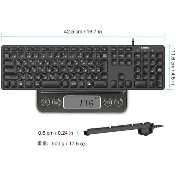 超軽量、薄型デザイン:コンパクトサイズ「16.7X 4.5 X 0.24インチ」と軽い重量「17.4オンス」、フルサイズで矢印キー、ショートカットキー、テンキーが付き、快適なタイピングが可能です。