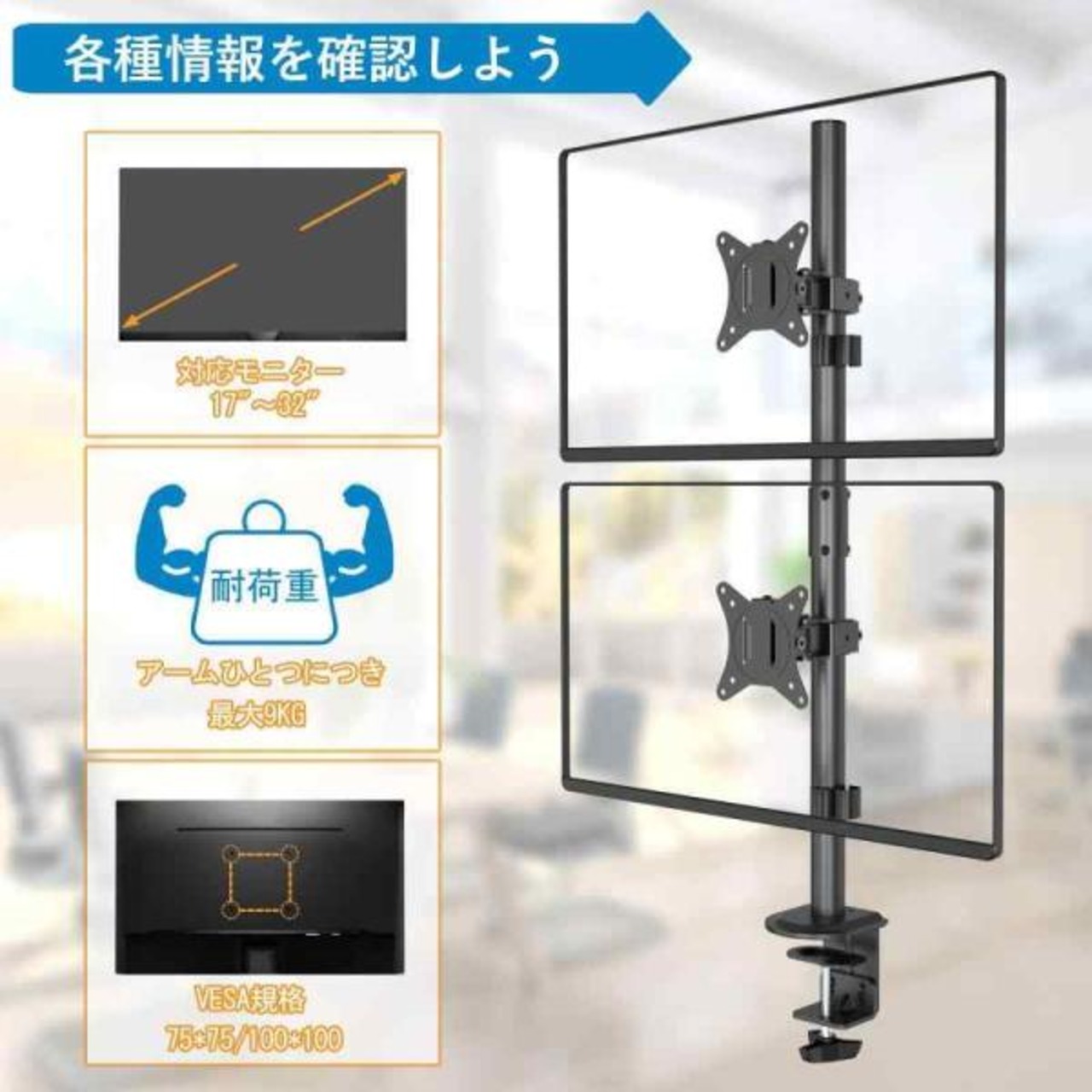 【商品仕様】本製品は最大32インチまでの液晶ディスプレイを上下に2枚配置できるデュアルモニターアームです。最大の特徴は80cmのロングポールを採用しており、高い位置にモニターを配置することができます。対応モニター:17〜32インチ 耐荷重:9KG*2 VESA規格:75×75/100×100mm。