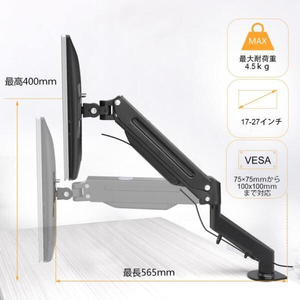 【商品仕様】15インチから27インチまでの液晶ディスプレイに対応できるモニターアームです。対応規格:VESAマウントインターフェース規格(FPMPMI)75mm/100mm 、耐荷重は1-6KGです。
