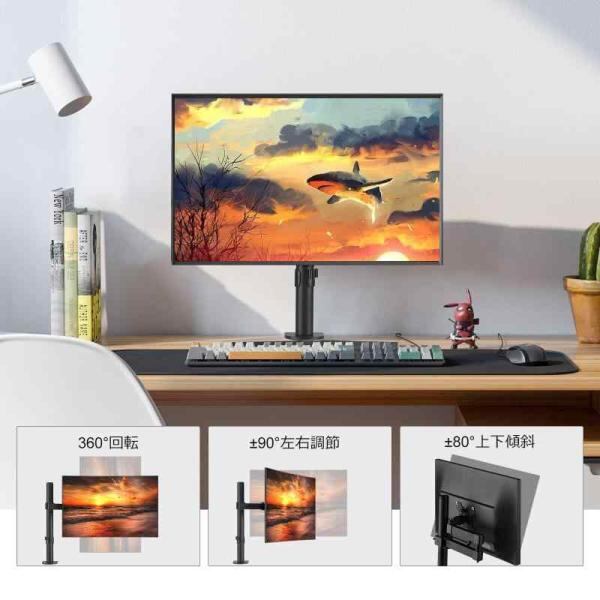【ディスプレイ角度を自由に変えれる】(1)アーム:ポールの接続部分移動で高さ調節(406mm) (2)VESAプレート部:上向き80°、下向き80°、回転360°、左右各90°。角度や距離などが自分に合って、前後左右に加えて上下も好みの位置に軽々と動かすことができます。ビジネスでの利用はもちろん、トレーダーやゲーマーの方にもおすすめです。 ご注意:付属の六角レンチでボルトを締めて傾斜角度を固定します。一方のモニターが低い場合は、ナットを取り外し、付属の六角レンチでボルトを反時計回りに回してモニターを上げます。調整後、ナットを取り付けます。