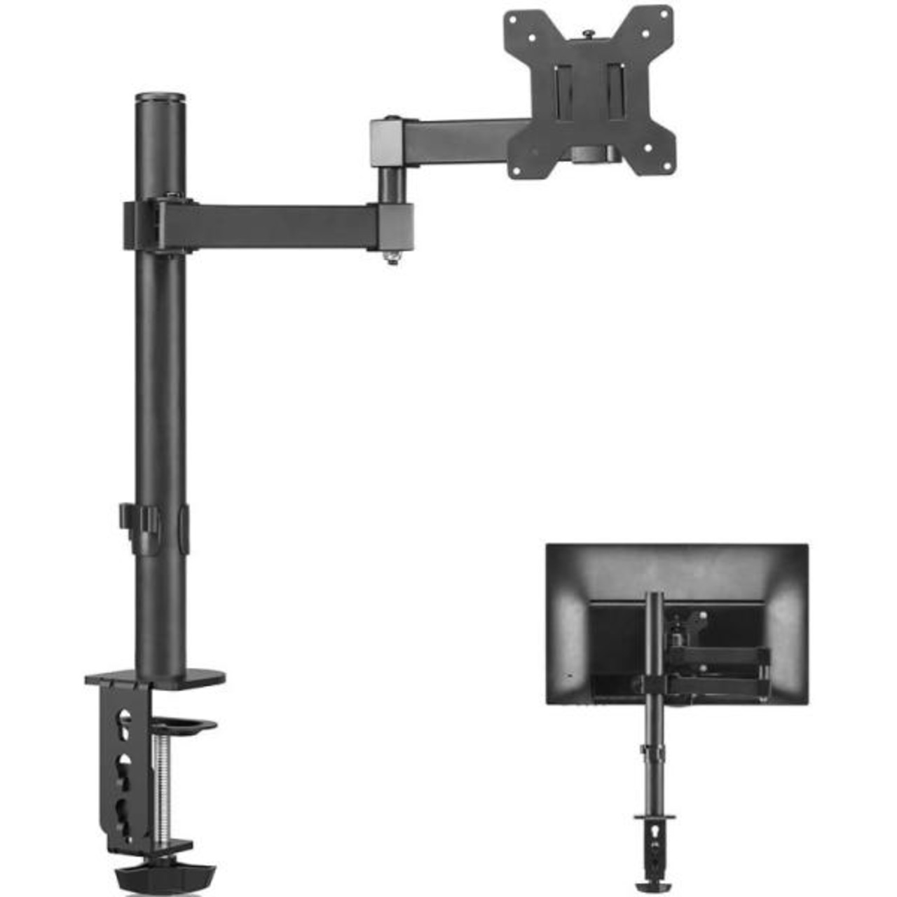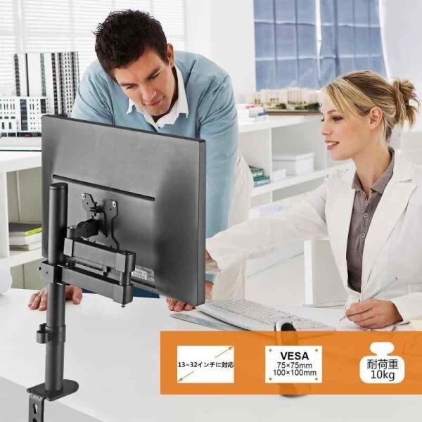 【対応モニター】液晶モニターを1画面設置できるディスプレイアームです。耐荷重は10KGで、VESA規格は75×75mm/100×100mmで、13~32インチPCモニターに対応します。