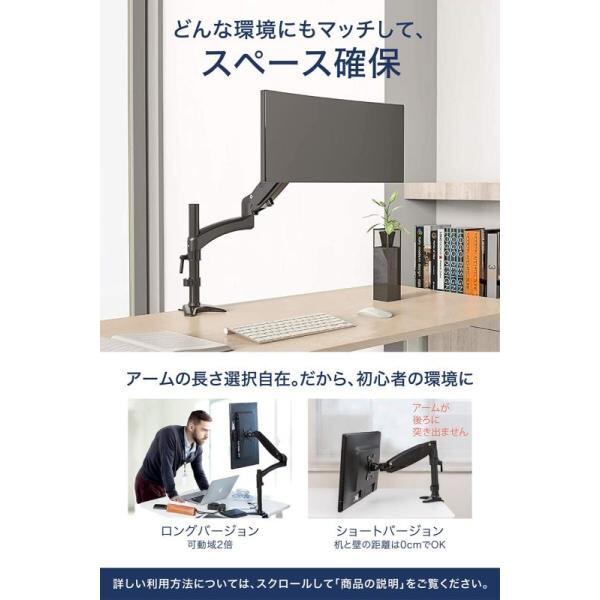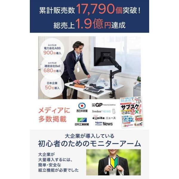 ?【 製品寿命10年 他社を圧倒する耐久性 】一流ブランドが導入しているハイエンドガススプリングだから、圧倒的な耐久性。30,000回のサイクルテストに合格。揺れに強く、製品寿命10年であることは実証済み。?【 お辞儀しない 垂れ下がらない 抜群の安定性 】モニターサイズ15〜32インチまで適用。初心者が利用するほぼ全てのモニターに対応。8kg以下のモニターを2台取付可能。 ハイエ