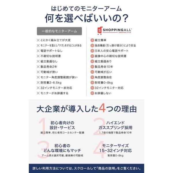 SHOPPINGALL カナダが愛した初心者用 モニターアーム ディスプレイアーム ガス スプリング モニター アーム 32インチ対応 耐荷重0〜8kg グロメット式&クランプ式 VESA対応 日本語説明書・動画付