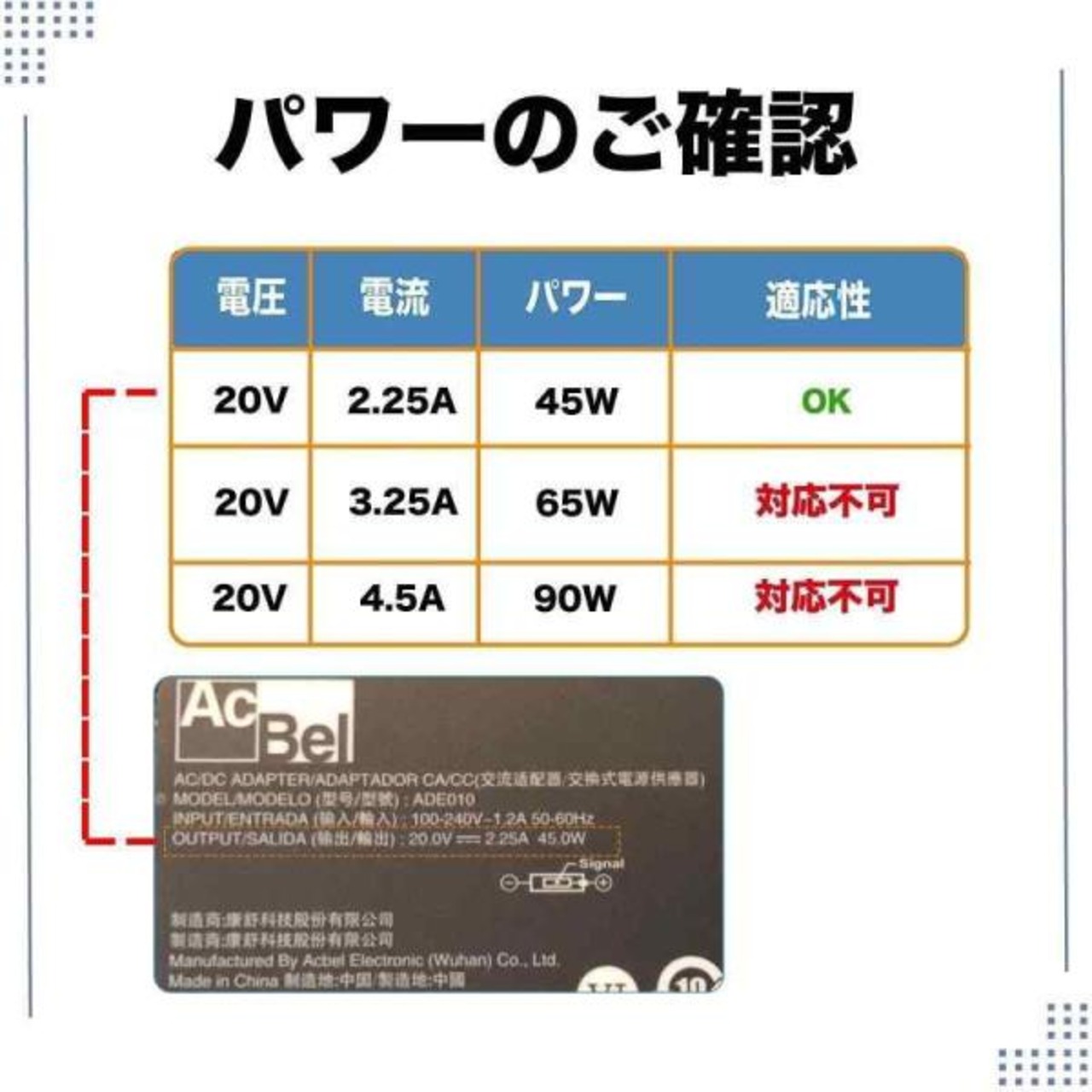 メーカー:ACアダプター業界世界大手ACBEL社の商品です。(LENOVO、NEC、HPなどのメーカーにも商品提供していますので、純正同様とご利用いただけます。)