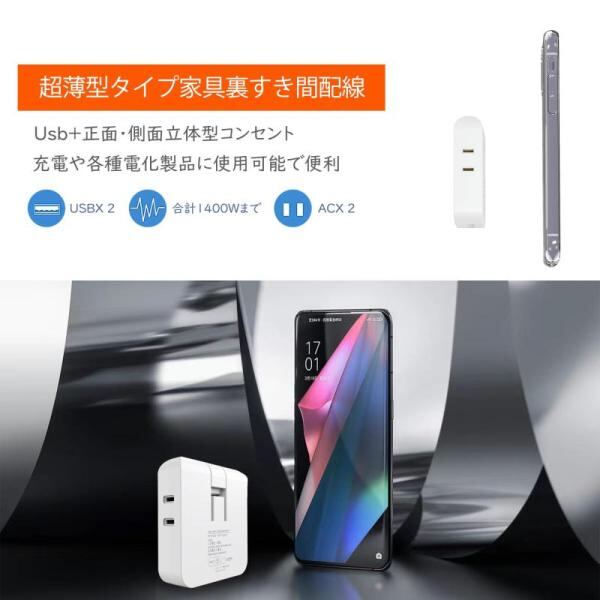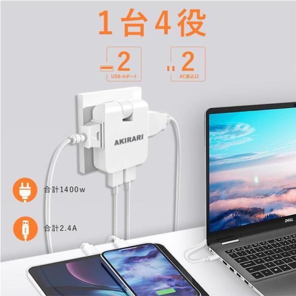 【1台4役の電源タップ usb付き コンパクト】2個のac差込口、2個のusb-aポートを搭載している電源タップ usb付き コンパクトです。2個のAC口はお互いに干渉しない。これ1つの電源タップ usb付き コンパクトで、4台の機器を同時に充電できます。