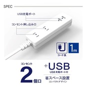 USB付き コンセント2個口 電源タップ コード長1m