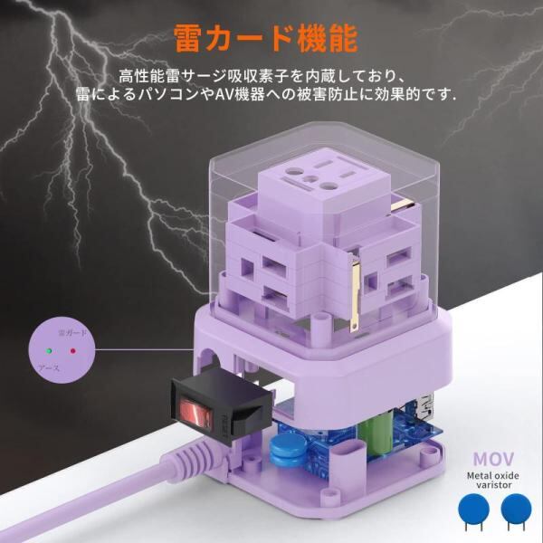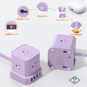 Micshion キューブ型電源タップ(2400W) 延長コード 2m コンセントusb付き 雷ガード 5個AC口 3個USBポート 1個Type-C タコ足配線 テーブルタップ OA マルチタップ 安全保護機能 自宅用 会社用 パープ