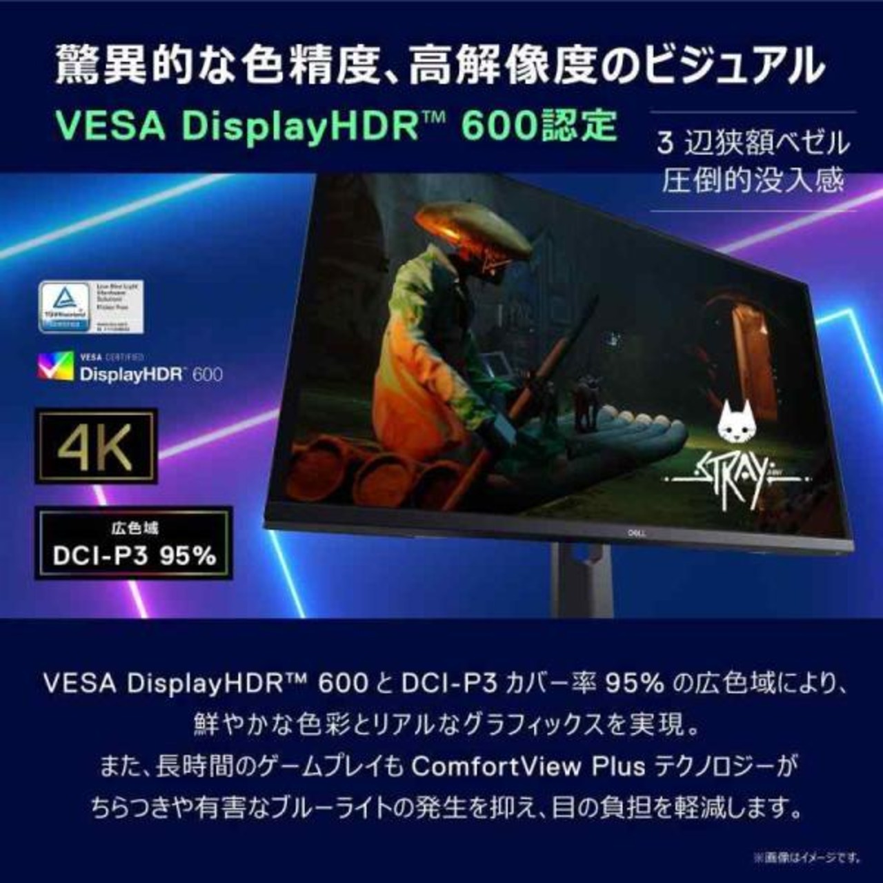 [色域]DCI-P3 95% [その他機能]AMD FreeSync Premium Pro,VESA DisplayHDR 600,PIP/PBP,ComfortView Plus,オンスクリーンディスプレイメニュー,背面ケーブルスロット [調節機能]高さ調整,傾き,スイベル(左右角度調整),VESA対応(100mm)
