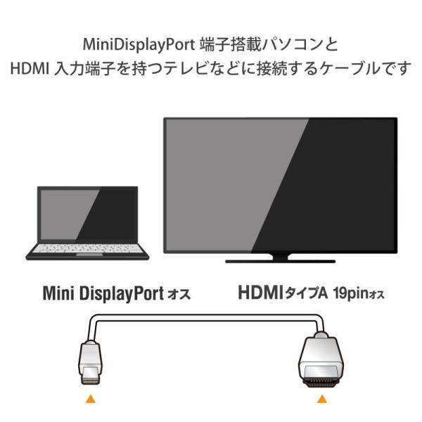 MacなどのMiniDisplayPort端子搭載パソコンとHDMI入力端子を持つテレビやディスプレイ、プロジェクターなどに接続するケーブルです。