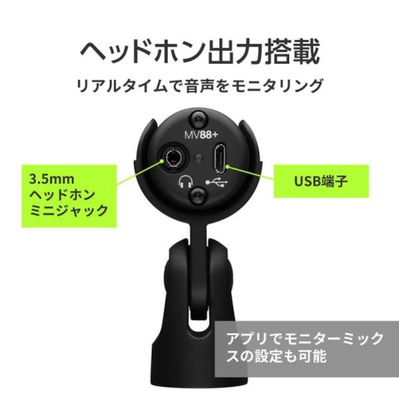無料のShurePlus MOTIVモバイルアプリまたはデスクトップアプリを使用した柔軟な設定。【5つのDSPプリセットモード】スピーチ、歌声、フラット、アコースティック、ラウド。【指向特性の選択】カーディオイド、双指向性、Rawミッドサイド、調整可能なステレオ幅。【カスタマイズ可能な5バンドEQ、コンプレッション、リミッター】