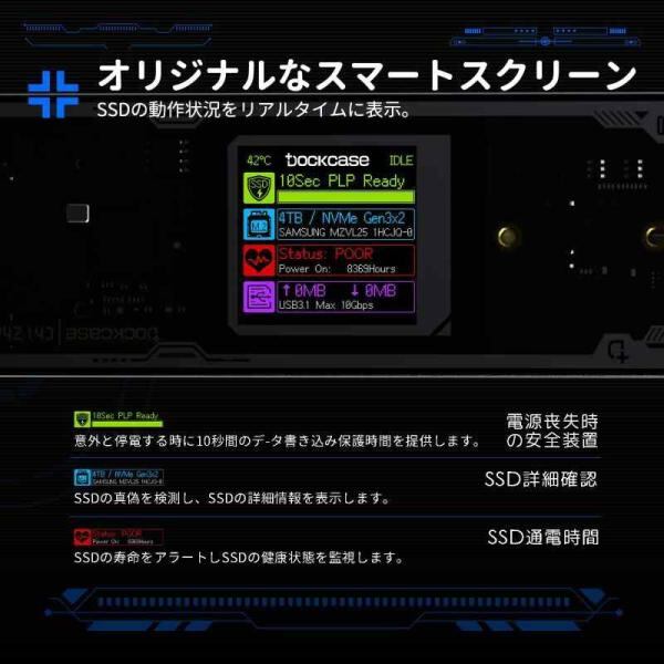 DOCKCASE M.2 NVMe SSDケース USB 3.2 Gen 2 Type-C (10 Gbps) IPS液晶ディスプレイと10秒 電源保護(PLP) 2230/2242/2260/2280サイズのNVMe PCIeに対応するハードディスクケース クリア設計 (Black)