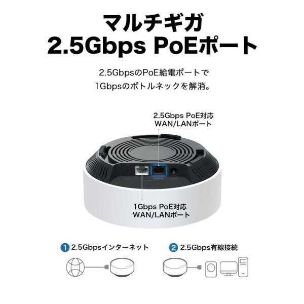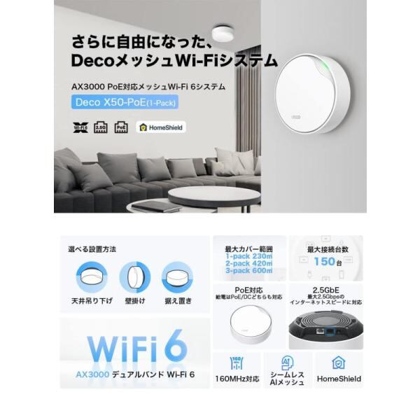 【特徴】プロの現場にも対応したDecoが登場 PoE給電に対応した2.5Gbps PoEポートを搭載したAX3000規格。本製品は1ユニット(単品)となります。