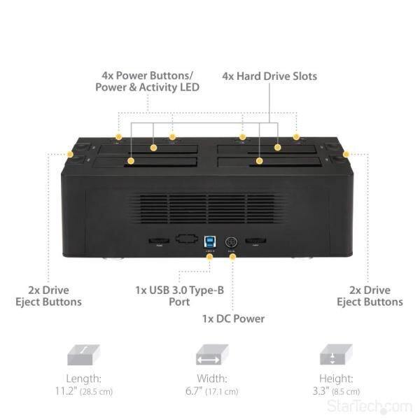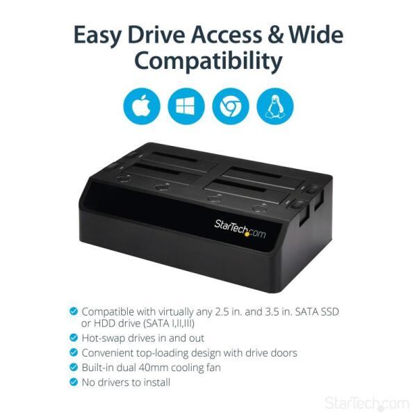 ハードディスクドッキングステーション: USB 3.2 Gen 1 (5Gbps)を介して最大4台の2.5/3.5インチSATAハードディスクにアクセスし、ファイルのバックアップ、イメージング、データ転送などの優れた機能を搭載した4ベイHDDスタンド。ツールレスデザインにより、素早いホットスワップを実現