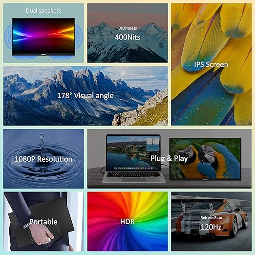 ?? 仕事と遊び - 複数の表示モード[コピーモード/拡張モード/セカンドスクリーンモード]。会議中はラップトップのコンテンツを 2 番目の画面としてコピーして他のユーザーと共有できます。職場では 2 番目の拡張画面として使用して生産性を向上できます。日常生活では、HDR モードに調整することで画像を新しいレベルにアップグレードし、より明るいハイライト、よりリアルな色と画像を提供できます。2 つの内蔵スピーカーにより、素晴らしい視聴体験とゲーム体験が提供されます。