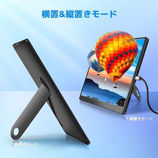 【キックスタンド付き.横縦置きもサポート】KOGODAZ1-9モバイルモニターはバックに折りたたみ式のキックスタンドが付いて、平らな面であれば、どんな場所でも使用可能です。市販のモバイルモニターのスマートカバーと違い、横表示時だけでなく、縦表示時(表示方向を設置する必要があります)も利用できます。それに、スタンドは、使用しないとき、背面の凹部に収納できるので、突出したり、厚みが増すことはなく、携帯便利となります。