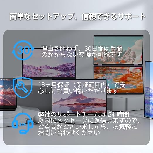 【商品保証&サポート】①商品出荷前に100%検品し、初期不良などの心配がございません。30日間無料返金と交換が対応します。ご購入日から1年間保証が付き、保証登録すれば、さらに2年間保証も延長できます。保証期間に製品は不具合が生じた場合は(人為的でない)、返金、交換、修理が対応します。②アフターサービス:当社はモバイルモニターの専門メーカーであり、技術問題が年中無休で対応できます。ご不明な点やご質問がございましたら、お気軽にご連絡ください。