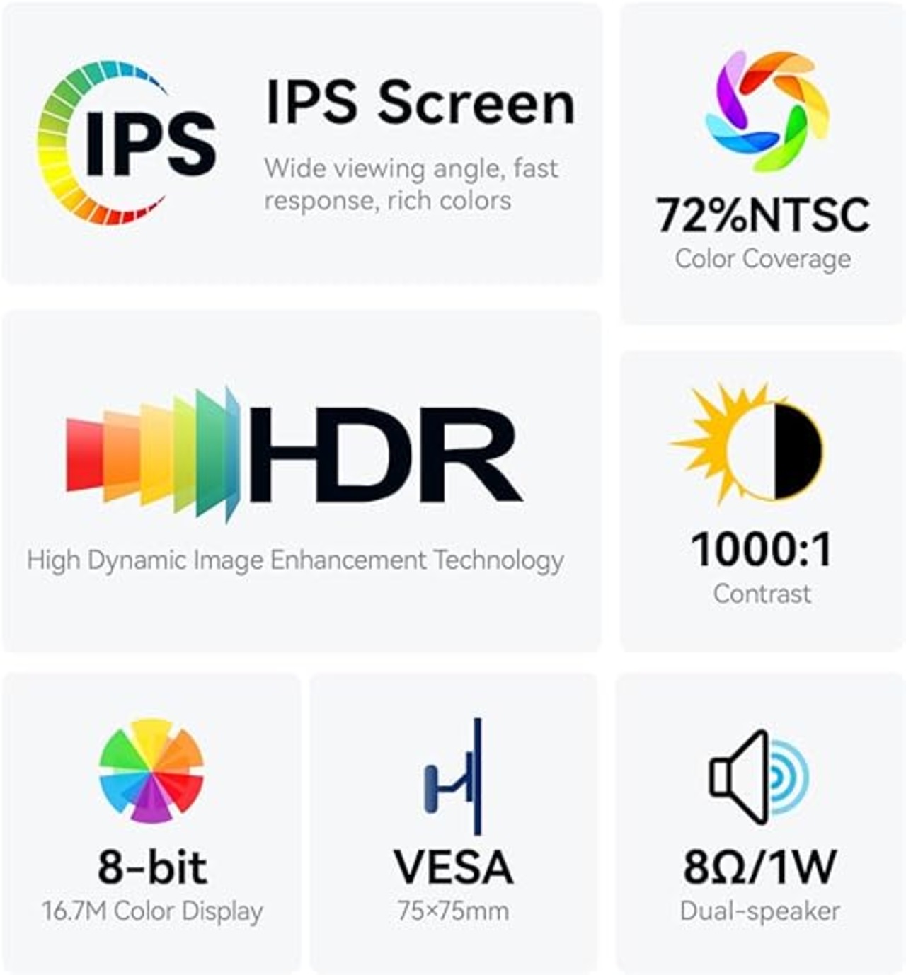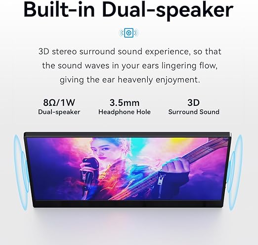【VESAマウント&デュアルスピーカー&3.5mmオーディオジャック】VESAホール付きで、ポータブルゲームモニターをスタンドに簡単に取り付けることができ、横向きモードとポートレートモードで画面をミラー/拡張し、高い生産性と効率性を実現します。 内蔵スピーカーにより、ビデオ、ゲーム、映画に自由にアクセスできます。3.5mmオーディオジャックで独自のスピーカーやヘッドフォンを追加して、より良いサウンドパフォーマンスを得ることができます。