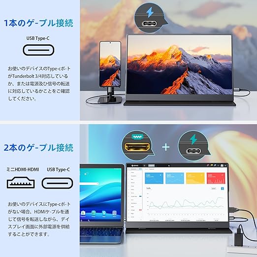 【ケーブル1本映像出力と電源供給・幅広く機種に対応】Type-Cケーブルを経由で接続対応のPCやスマホなど、映像出力と電源供給を1本のケーブルで行うことができます。(※給電が足りない場合は付属のACアダプターをご使用ください。接続がすごく簡単なので、いつでもどこでもYouTubeやゲーム・映像を楽しめて、ビジネスではweb会議やプレゼンテーションにも使えます。ノードPC、デスクトップ、スマートフォン、PS4/PS5、XBOXやSwitch、Macbook、MacMini、Ipad(Type-Cポートモード搭載)など、幅広いデバイスに対応しています。パネル拡張モードやコピーモードに対応し、横型ディスプレイを簡単に設置することができ、仕事の相談やプレゼン、ゲームや映画を楽しむなど、いつでも気軽に利用することができます。
