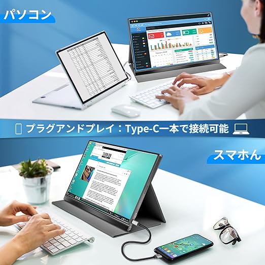 【横/縦置き可能ポータブルモニター】PCのサブモニターとして、拡張モード・複製モードは両対応の上、横表示はもちろん、縦表示でも簡単接続できます。友達と動画鑑賞やゲームの画面複製、また自宅のデスクトップでは二画面での作業をして、同じ環境が持ち出せるのは思った以上に便利です。ノートパソコンのデュアルモニターとして使うのは十分です。【自動省エネモード】モニター本体或いは接続の端末へ給電しない場合、スクリーンの明るさが記憶されずに自動初期に戻り、低輝度になります。明るくしたければ、手動で調整できます。