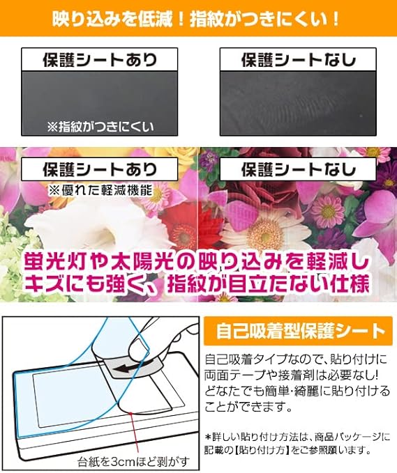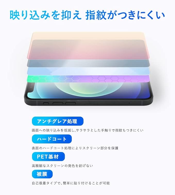 貼ったときの画面のギラツキを抑えた、高光沢に近いアンチグレアフィルムです。日光や蛍光灯の反射を抑え、画面が見やすくなる機能に加え、表面がさらさらなので指すべりもよく、指紋が目立ちません。