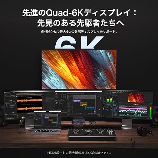 【Quad 6K@60Hzディスプレイ】2021/2023年製のM1/M2/M3 Maxチップ搭載のMacBook Proシリーズのみがクアッド拡張ディスプレイをサポートしています。2021/2023年製のM1/M2/M3 Proチップ搭載のMacBook Proシリーズはデュアル6K@60Hzディスプレイのみをサポートしています。2020/2022年製のM1/M2/M3チップ搭載のMacシリーズは単一の6K@60Hz拡張ディスプレイのみをサポートしています。注意: このドッキングステーションはWindowsラップトップと互換性がありません。