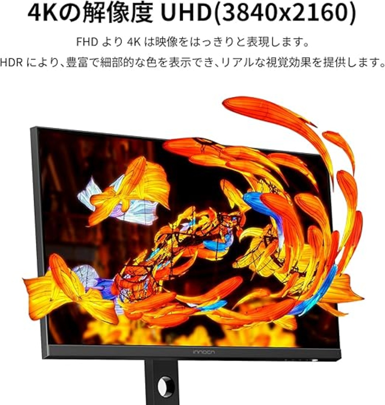 【没入型の視覚体験】INNOCN27インチ4KモニターUHD 3840*2160p 16:9画像、HDR、99%sRGB&99%Adobe RGB&99%のDCI-P3、ΔE <2 、60Hz、300nits高輝度パネル。INNOCNの4Kタッチモニターは99%のDCI-P3と99%のAdobe RGBカバー率を組み合わせており、クリアな画質と完璧なカラーリーダリングを提供します。
