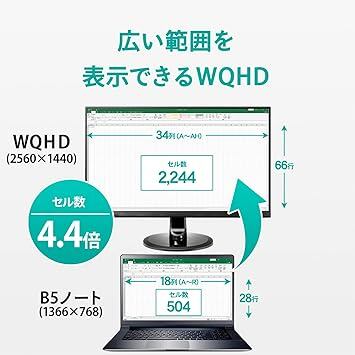 【WQHD対応!ワイド液晶ディスプレイ!】WQHD解像度に対応した液晶ディスプレイです。WQHDとは、フルHD(1920×1080)の約1.8倍の作業領域を実現する2560×1440ドットの解像度です。ゲームやデザイン、ビジネスシーンでより多くの情報を表示し、快適な作業を行うことができます。