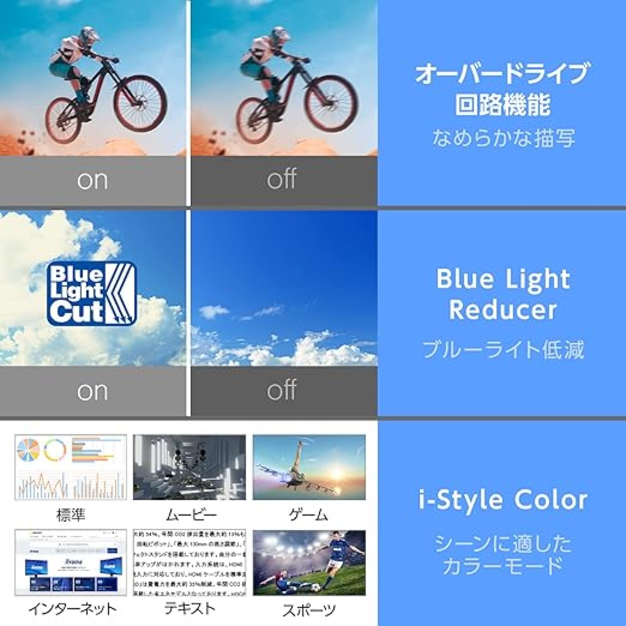 [画面]23インチ/1920×1080 フルHD/IPSパネル/ノングレア(非光沢)/表示色:約1,677万色/左右各89°上下各89°の広視野角/アスペクト比:16:9