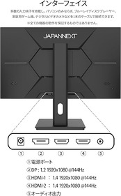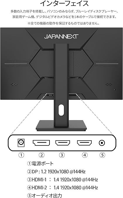 インターフェイスはHDMI 1.4 (144Hz) x2、DisplayPort 1.2 (144Hz) x1を装備、ゲーム機やパソコンだけでなく、様々な機器との接続が可能です。