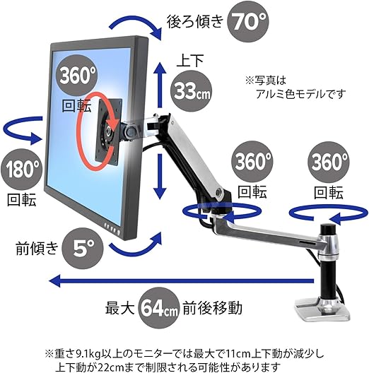 前後伸縮64cm、昇降33cm(9.1kg以上のモニターでは最大11cm昇降範囲の減少が起こる可能性があります)。