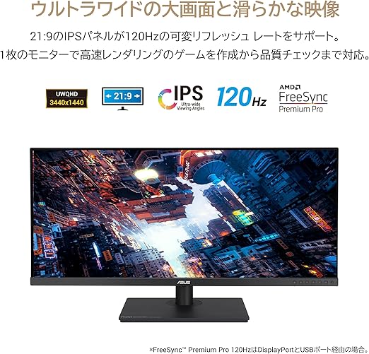 〔画面〕34型ワイド/3440x1440/ノングレア/350cd/m2 (typ) 400cd/m2 (HDR on)/バックライト:LED/パネル種類:IPS/最大2ms(GTG)/画素ピッチ:0.232mm/コントラスト比:1000:1(typ)/視野角:水平178°、垂直178°