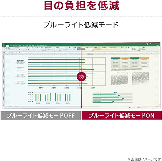 【目にやさしい機能を搭載】 ブルーライト低減モード/フリッカーセーフ 紙に近い色温度で表示することで眼精疲労や生活リズムに影響を及ぼすとされているブルーライトを抑えるブルーライト低減モード、従来のLEDモニターで画面の明るさを抑えた際に発生していた、ちらつきを調光方式を変更することで抑えたフリッカーセーフ機能を搭載。