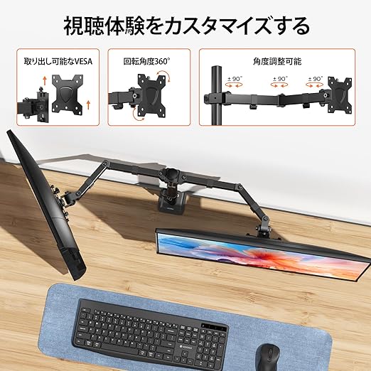 【自由な角度調整】デュアルアームモニタースタンドは2画面共に前後±72°チルト、左右90°の回転、360°スイベル可能で、アームの最長320mm、高さ430mmまで調整できます。 最適な視野角が得られます。