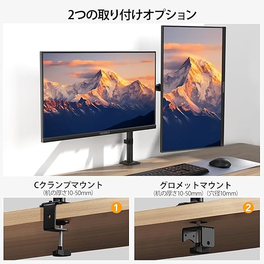 【組み立てと設置が簡単】デュアルアームモニタースタンドの2つの取り付けオプション:「C」字型クランプ固定とグロメット固定。厚さ10mm〜50mmデスクトップ用、グロメット固定はボルト通し穴(穴径10mm)のあるテーブルトップに適しています。詳しくは、ビデオと組み立て説明書をご覧ください。