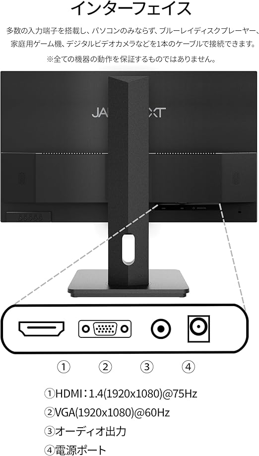 インターフェイスはHDMI1.4端子を1つとVGA端子を1つ搭載しています。VGA端子を搭載しますので以前からご使用のPCのなども使用が可能です。