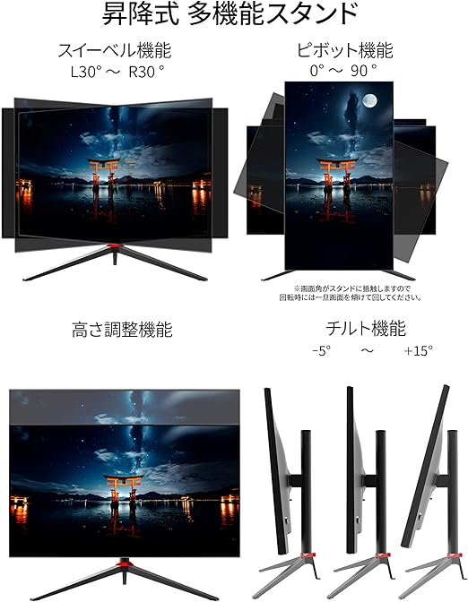 高さ調整が可能な昇降式スタンドを搭載、130mmの範囲内で最適な高さに画面を調整可能です。また縦画面として使用出来るピボット(回転)機能にも対応します。