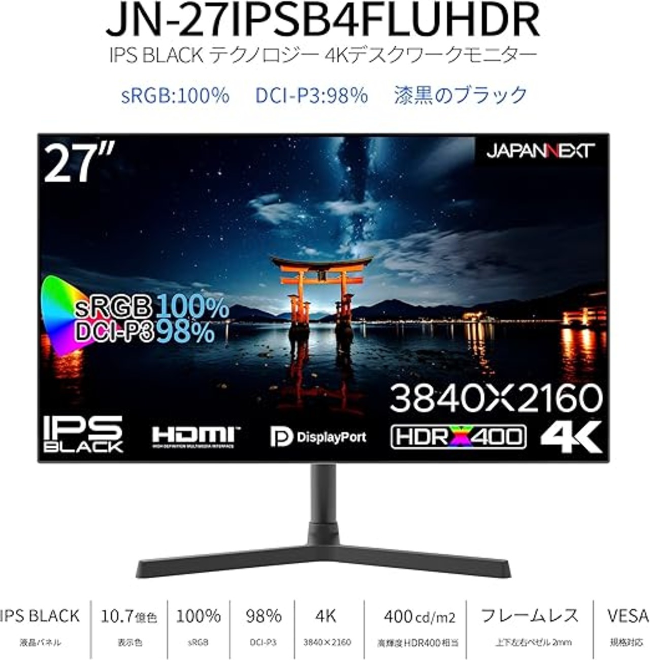JAPANNEXT 27インチ IPS BLACKパネル搭載 4K(3840x2160)解像度 液晶モニター JN-27IPSB4FLUHDR HDMI DP HDR sRGB 100% DCI-P3 98% 4辺フレームレスモデル PIP/PBP機能 | PCBASE