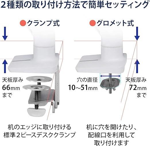 デスククランプとグロメットマウントは付属しています。デスククランプは66mmまでの厚さ、グロメットマウントは直径10~51mmの穴、72mmまでの厚さに取り付け可能。