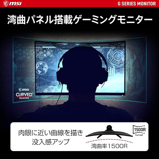 ●最大リフレッシュレート:75Hz●応答速度:1ms(MPRT)●パネル駆動方式:VA●表面タイプ:ノングレア●湾曲率:1,500R