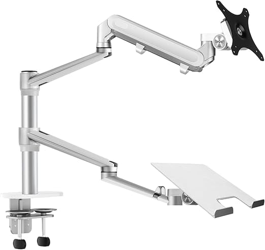 デュアルアーム: ガススプリング式 アームとクランク式アームの組み合わせのデュアルアーム仕様です。 VESAマウントおよびノートPCホルダーはクイックリリース機能付きで取り付け・取り外しがとても簡単に行えます。 ノートパソコンとモニターを左右入れ替える場合でも工具なしで取り換えも簡単に行うことができます。
